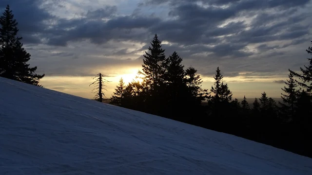 Comme chaque jeudi une nocturne symp...ose, mais avec le changement d'horaire et les quantité de neige on peut se permettre de ne pas sortir les lampes de la poche. D'habitude d'Andey, on change pour le Jura...avec un magnifique couché de soleil, un apéro qui nous ouvre l'appétit pour la fondue à la Givrine.